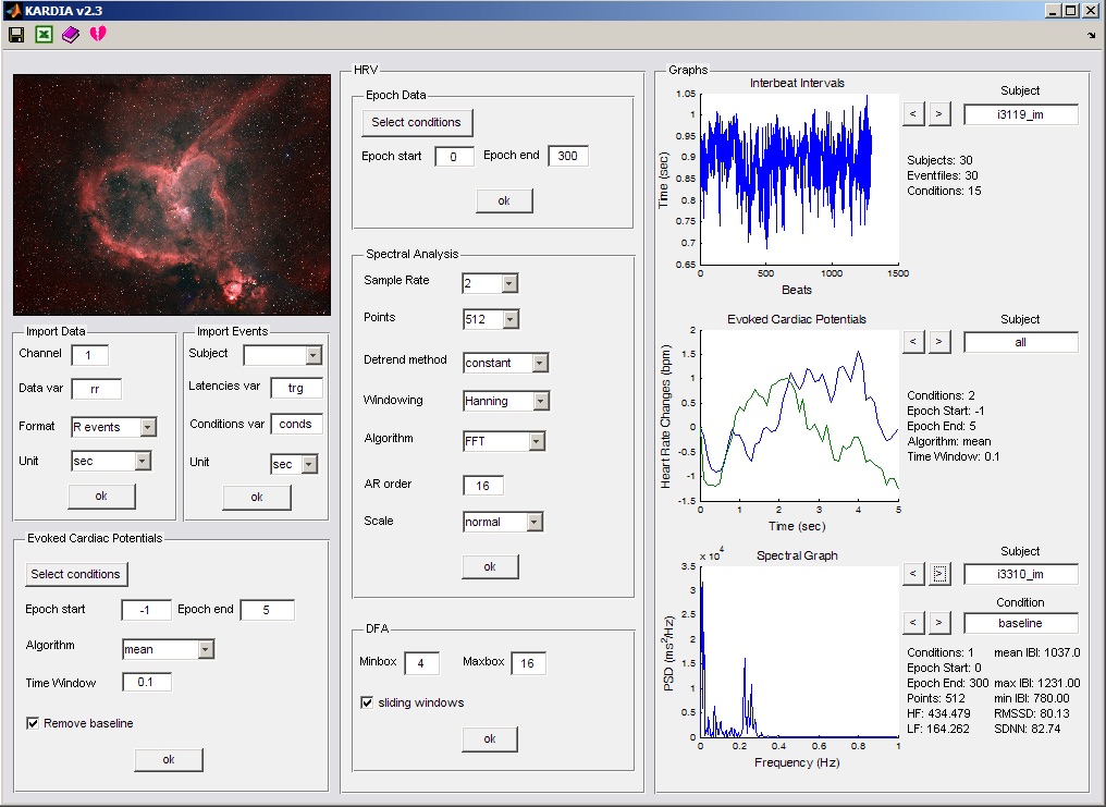 MATLAB toolbox (καρδιά — “heart” in Greek) for the analysis of cardiac interbeat interval data. Provides a GUI for phasic cardiac response analysis, standard HRV metrics, and detrended fluctuation analysis (DFA) of scaling exponents.